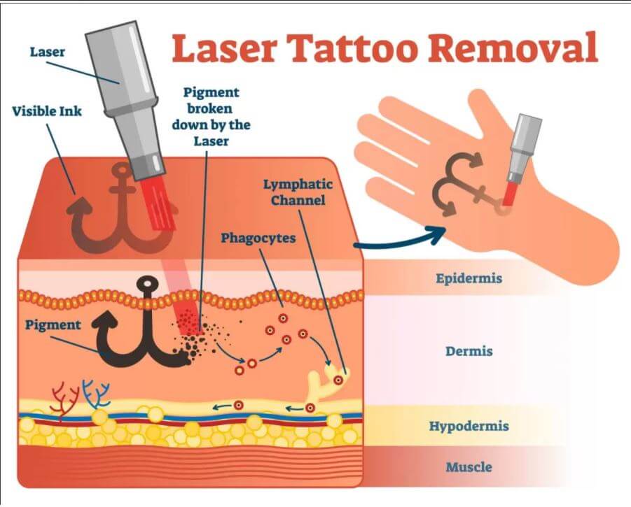 Máy xóa hình xăm bằng Laser là hoạt động bằng cách chiếu trực tiếp ánh sáng Laser vào bề mặt có hình xăm, ánh sáng Laser được thiết lập ở các bước sóng khác nhau để loại bỏ những màu mực xăm khác nhau. Mực màu đen là dễ loại bỏ hoặc dễ phai nhất, màu đỏ, xanh lam, xanh lục có thể lâu hơn một chút.